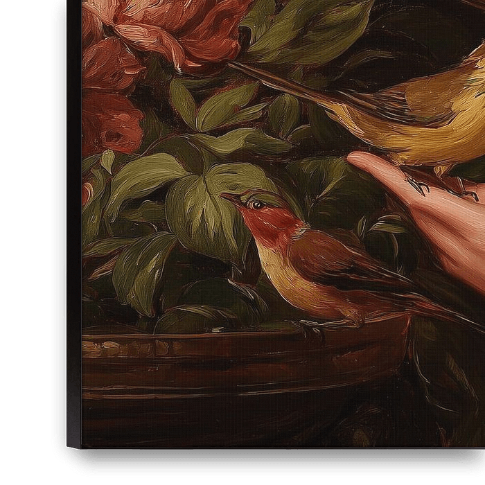 Tweede opvallend element: de vogels en de hand. Opgevouwen als een stille dialoog houdt de vrouw haar hand omhoog, en een gele vogel landt op haar hand, een andere kleine roodkopvogel zit lager op een rand, en een blauwe vogel nestelt zich tussen de bloemen boven haar ooglijn. Die vogels werken als levende leestekens in het portret: ze geven richting, beweging en geluid aan een anders stille compositie. De verfkleur van de vogels is scherp en helder — geel en blauw contrasteren tegen het zachte bloemengeweld — zodat ze opvallen als kleine accenten. In dit vogel schilderij zijn de vogels speels maar ook fragiel, ze suggereren gesprek en aandacht zonder dat er woorden nodig zijn.