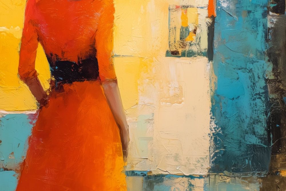 Cette œuvre est axée sur le contraste et l'équilibre. La femme se tient dos au spectateur et semble presque se fondre dans son environnement. Les tons chauds d'ocre et de jaune se heurtent ici délicatement aux tons froids de bleu et de turquoise. Cette combinaison de couleurs confère au tableau de la tension, mais aussi de la…