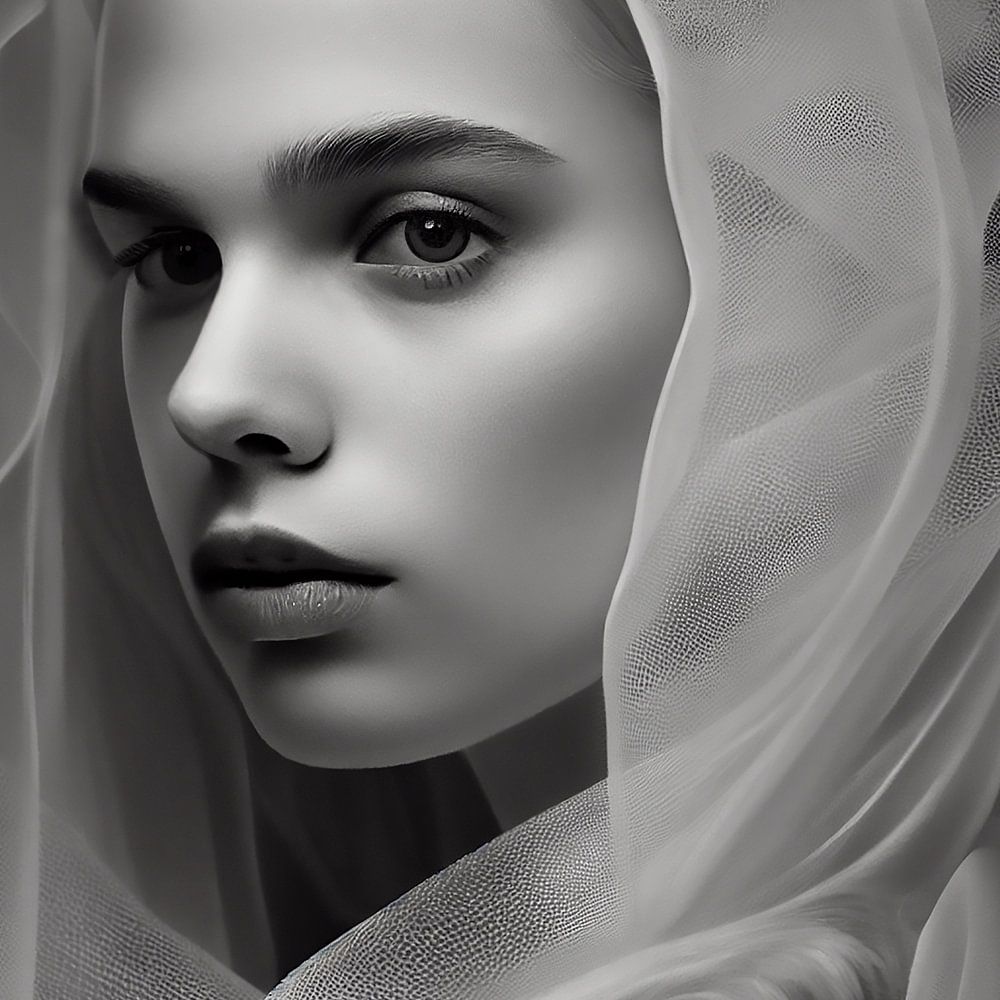 Image en noir et blanc d'une belle femme enveloppée de soie. Belle lumière, donnant un contraste étonnant. Convient à diverses tendances.