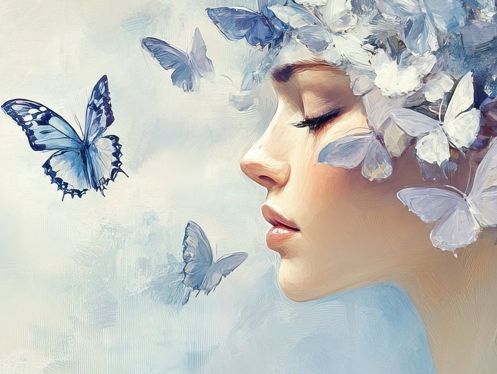 Femme et animaux ailés - Ce tableau de femme montre une femme à la tête pleine de papillons, qui semble flotter sur un fond bleu pâle doux et plein de tons clairs.