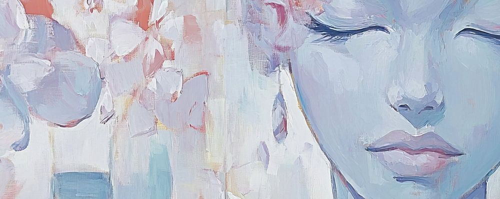 Détails : peinture femme, portrait, peinture fleur, tranquillité, méditation, atmosphère sereine, pastel, rose, bleu, art