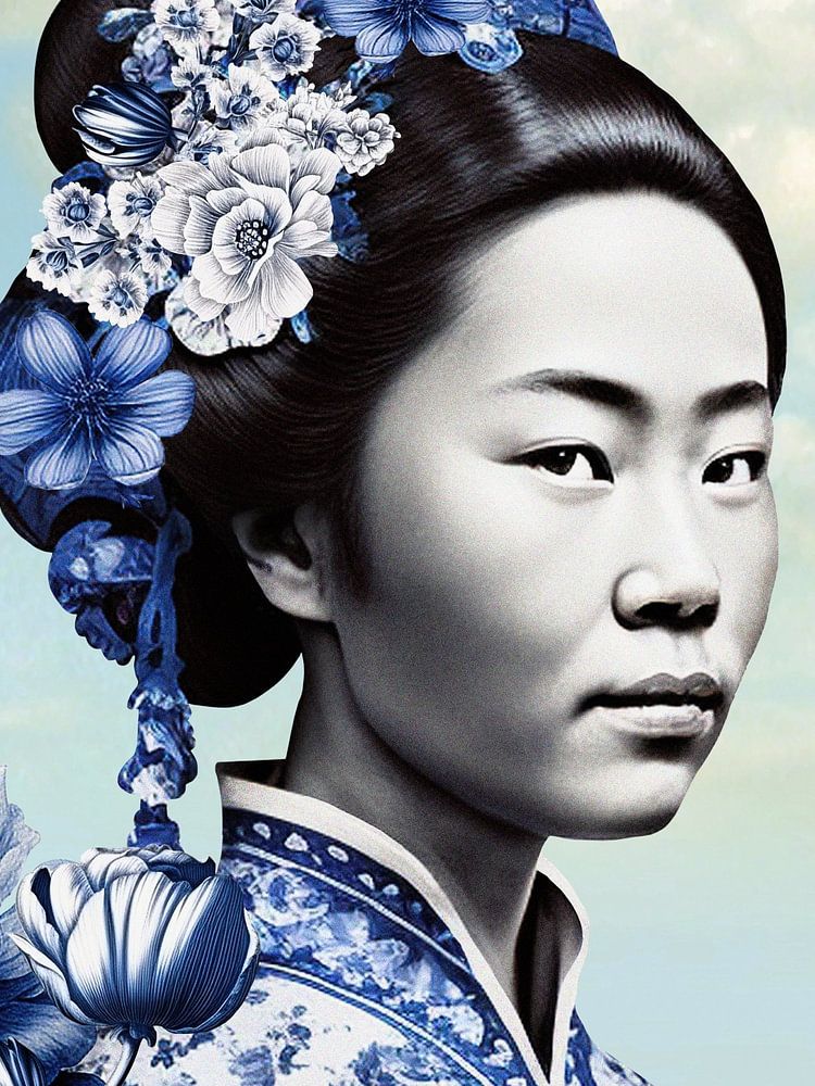 A propos de "Femme japonaise en Delftware sur fond de nuages, variation moderne d'un portrait de Geisha"