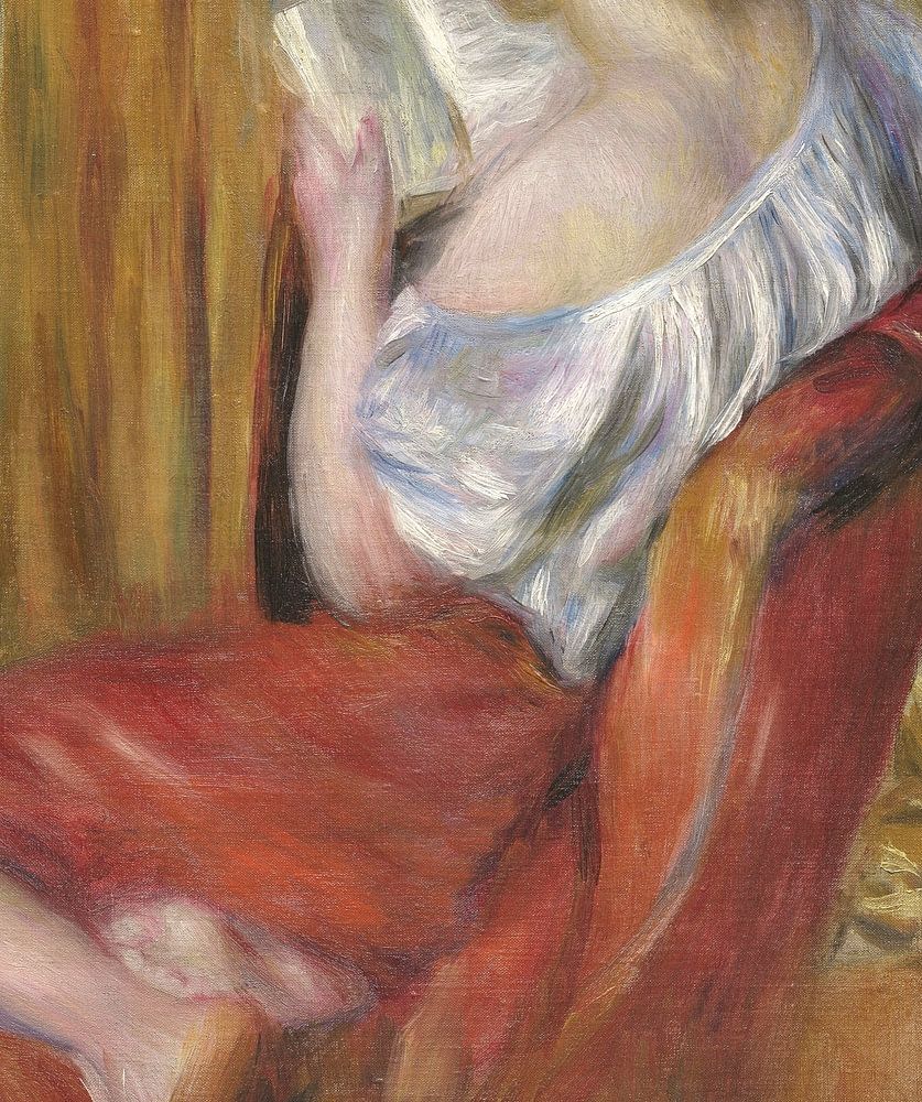 Pierre-Auguste Renoir était un peintre français connu pour son style impressionniste. Son œuvre "Woman Reading" est le portrait d'une femme assise sur une chaise en train de lire un livre. C'est une scène calme et intime, et Renoir a magnifiquement utilisé la couleur et la lumière pour créer cette atmosphère. C'est une œuvre unique et poignante qui montre comment Renoir voyait la beauté de la vie quotidienne.