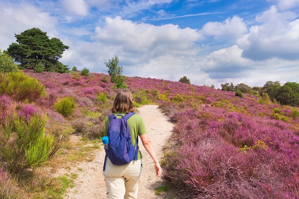 Femme marchant dans la bruyère en fleurs sur le Posbank par Rob Kints