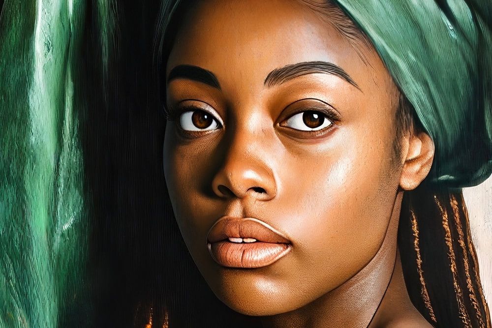 Cette peinture à l'huile captivante montre une jeune femme noire portant un turban vert qui ne laisse apparaître qu'une partie de son visage. L'expression de son visage est mystérieuse et gracieuse, tandis que d'élégants drapés verts enveloppent une partie de son corps, conférant au tableau une présence calme mais captivante. Les plis doux du tissu et la technique de peinture habile donnent une sensation de profondeur et de mouvement qui souligne la délicatesse et en même temps la force de la femme représentée.