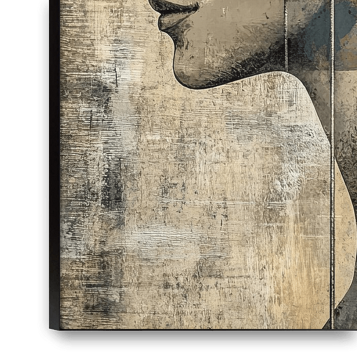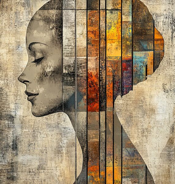 Femme or - Il s'agit d'un tableau de femme, un tableau de femme de profil calme avec les yeux fermés où le visage est peint de manière réaliste dans des tons beige et terre, et l'arrière de la tête et le cou sont composés de blocs et de bandes verticales colorées dans des tons chauds d'or, d'orange et de pétrole, dans un style moderne et semi-abstrait.