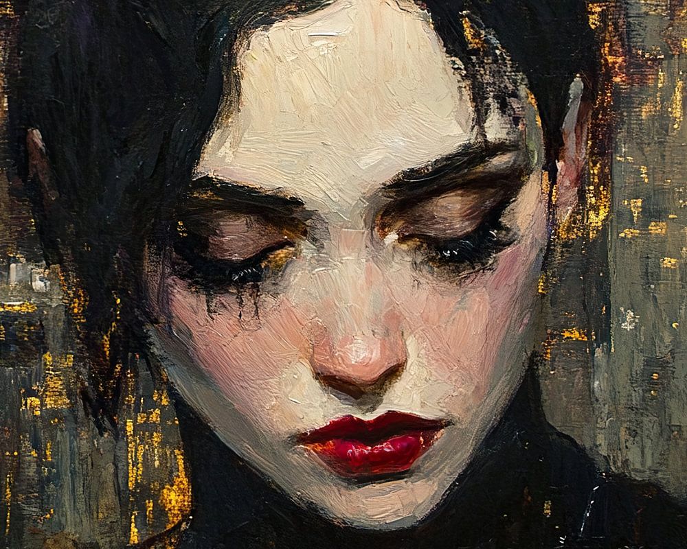 Femme paysage urbain | Regard de minuit - Cette peinture de femme montre une femme mystérieuse aux cheveux noirs et aux lèvres rouges, sur fond de paysage urbain vibrant, éclairé à l'or.