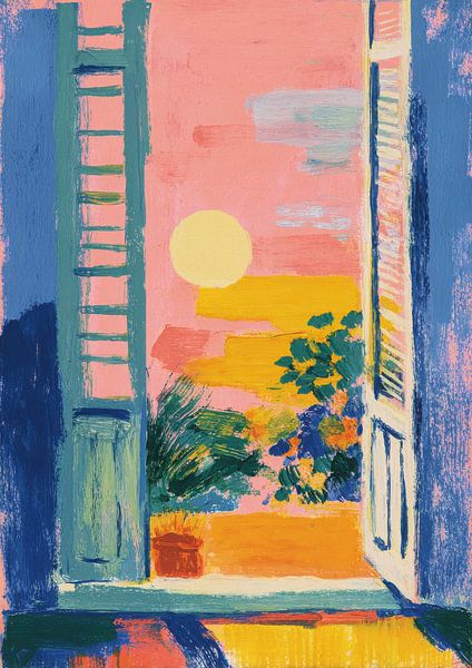 Cette peinture abstraite montre une fenêtre ouverte d'un vert sourd, qui laisse entrevoir un lever ou un coucher de soleil lumineux. Le ciel rayonne de jaune-orange, de rose et de bleu doux, avec une boule de soleil ronde et jaune clair légèrement décalée. Par la fenêtre, on voit une végétation verte luxuriante, de l'herbe et un petit…