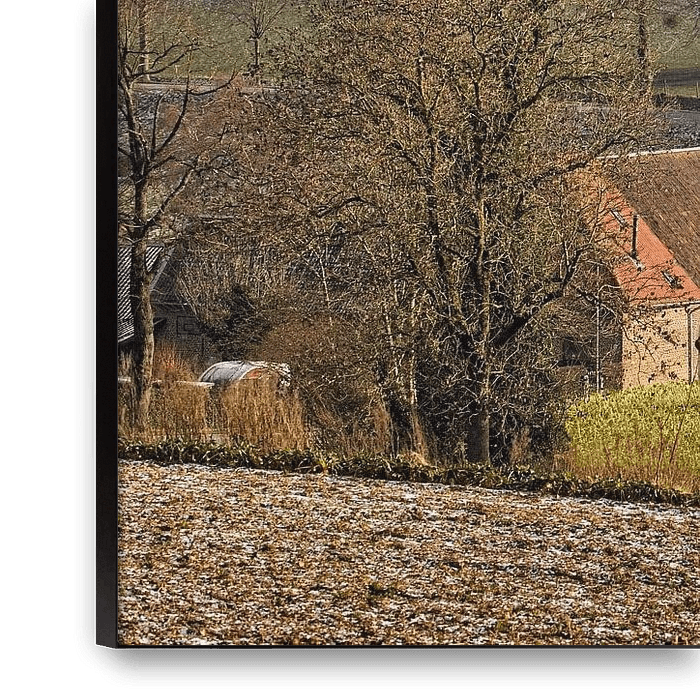 La région des collines du Limbourg méridional par une journée d'hiver près de Harles. En arrière-plan, les maisons de Wolfhaag/Raren et la tour d'observation du Drielandenpunt près de Vaals.