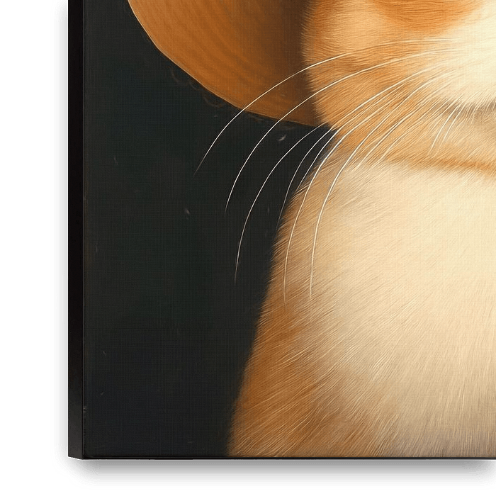 Un charmant chat au pelage crème et orange porte un chapeau à larges bords orné d'une fleur. Le regard du chat est majestueux et calme.