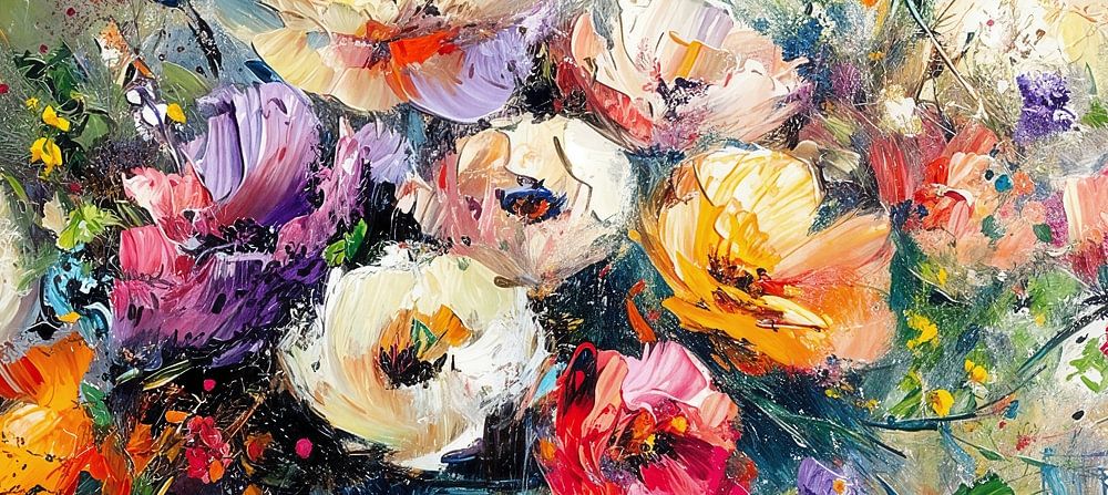 Festival floral coloré - Cette peinture vibrante offre une explosion de couleurs avec un bouquet de fleurs comme point central. Le style est lisse et moderne, avec une touche de peinture épaisse qui ajoute de la texture et du dynamisme. Les couleurs vont des rouges et oranges chauds aux bleus et violets froids, avec des touches de blanc et de jaune qui font vraiment ressortir la toile.