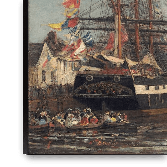 Journée du drapeau avec des navires décorés Honfleur est une ville de France. Il se trouve en Normandie, sur la rive sud de l'estuaire de la Seine, en face du Havre. Eugene Boudin (Honfleur, 12 juillet 1824 - Deauville, 8 août 1898) était un peintre, dessinateur et graveur français. Il est principalement connu pour ses paysages marins…