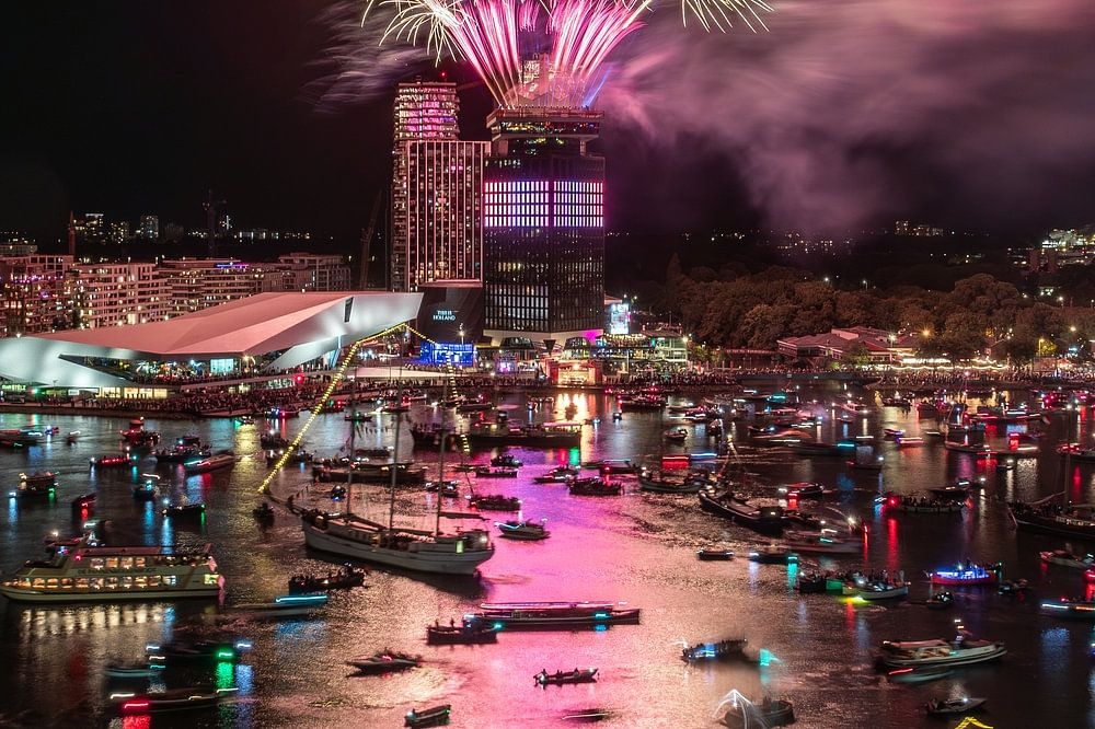 Alors que le soir tombe sur Amsterdam et que l'IJ se remplit de milliers de bateaux illuminés, SAIL Amsterdam 2025 atteint son apogée : le traditionnel feu d'artifice de clôture. Cette photo capture ce moment magique : une mer de lumière et de couleurs, avec d'impressionnants feux d'artifice au-dessus de l'emblématique tour A'DAM et du moderne musée du film EYE.