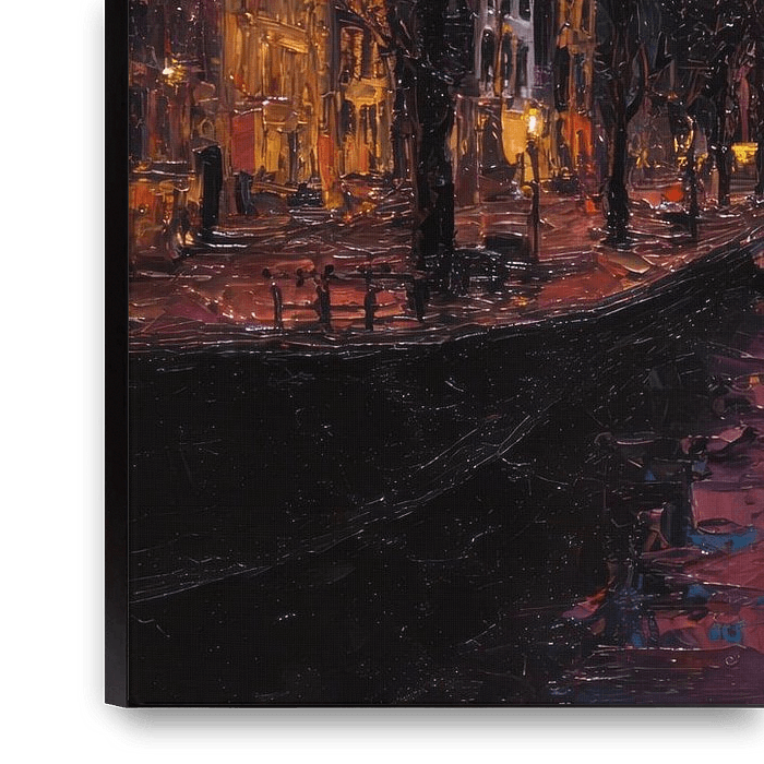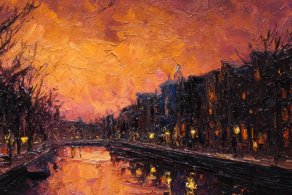 Le ciel est d'un orange et d'un rose intenses, comme si le soleil venait de disparaître sous l'horizon, laissant derrière lui une dernière lueur. Les silhouettes des arbres et des façades se détachent nettement contre la lumière. L'eau reflète des couleurs vives, rouges et violettes.