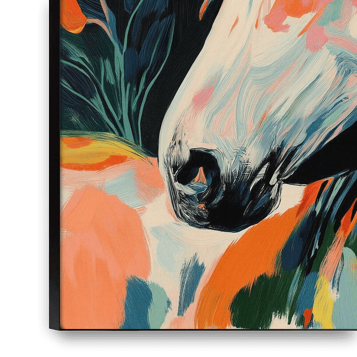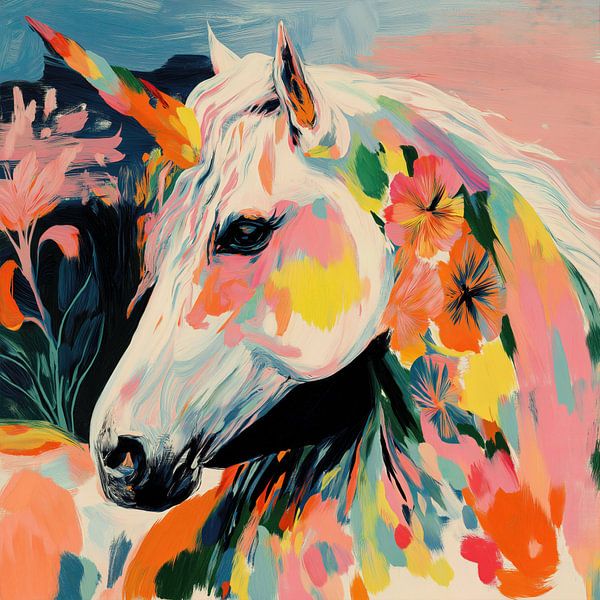 Un cheval blanc lumineux rendu par des traits audacieux et picturaux de corail, de bleu sarcelle et d'or, alliant la douceur florale à une expression vibrante.