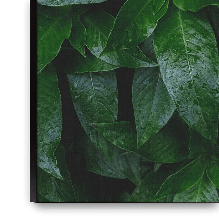 Cette image montre une accumulation dense de feuilles vert foncé qui semblent vivantes grâce à leur surface brillante. De fines gouttes de pluie renforcent l'éclat naturel et confèrent au motif une légèreté rafraîchissante. Les différentes formes et tailles des feuilles créent une structure naturelle qui apporte profondeur et dynamisme…