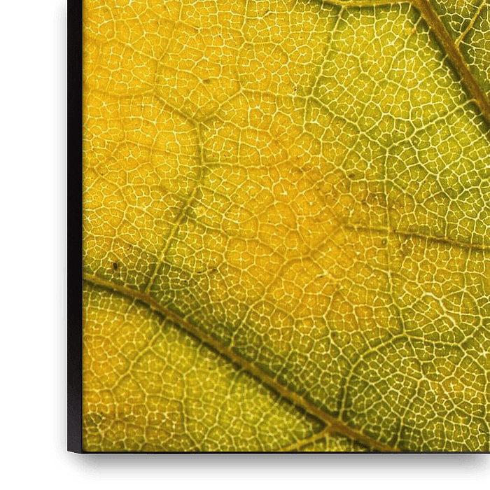 Cette œuvre d'art présente la fascinante macrophotographie d'une feuille d'automne, dont la structure et le jeu de couleurs capturent la beauté poétique de l'éphémère. La surface de la feuille est traversée par un réseau complexe de veines finement ramifiées, qui agit comme une architecture naturelle - organique, rythmique et pleine de…