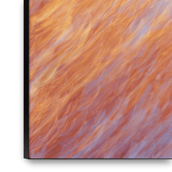 L'exposition longue et le mouvement donnent naissance à ces flammes de couleurs automnales. En douceur, ces feuilles d'érable s'écoulent de gauche à droite sur un fond de ciel bleu clair, créant une image abstraite.