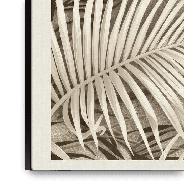 Cette œuvre d'art tendance représente un riche feuillage de feuilles de palmier, exécuté dans une palette de tons beige et sépia qui exsudent un sentiment de tranquillité et d'élégance.