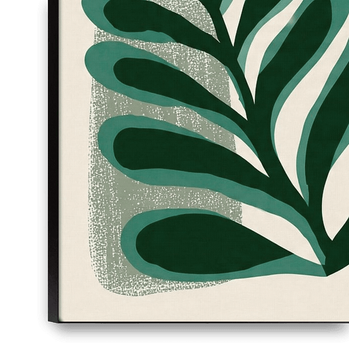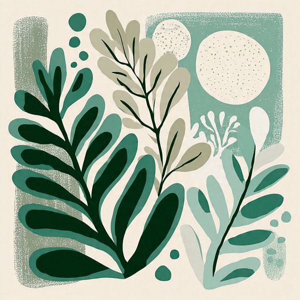 Des feuilles stylisées forment un motif botanique abstrait et calme. Les tons verts atténués créent un rythme visuel apaisant. Des formes simples donnent à l'œuvre d'art une touche de modernité. La composition équilibrée est fraîche et intemporelle. Idéal pour les intérieurs minimalistes et scandinaves.