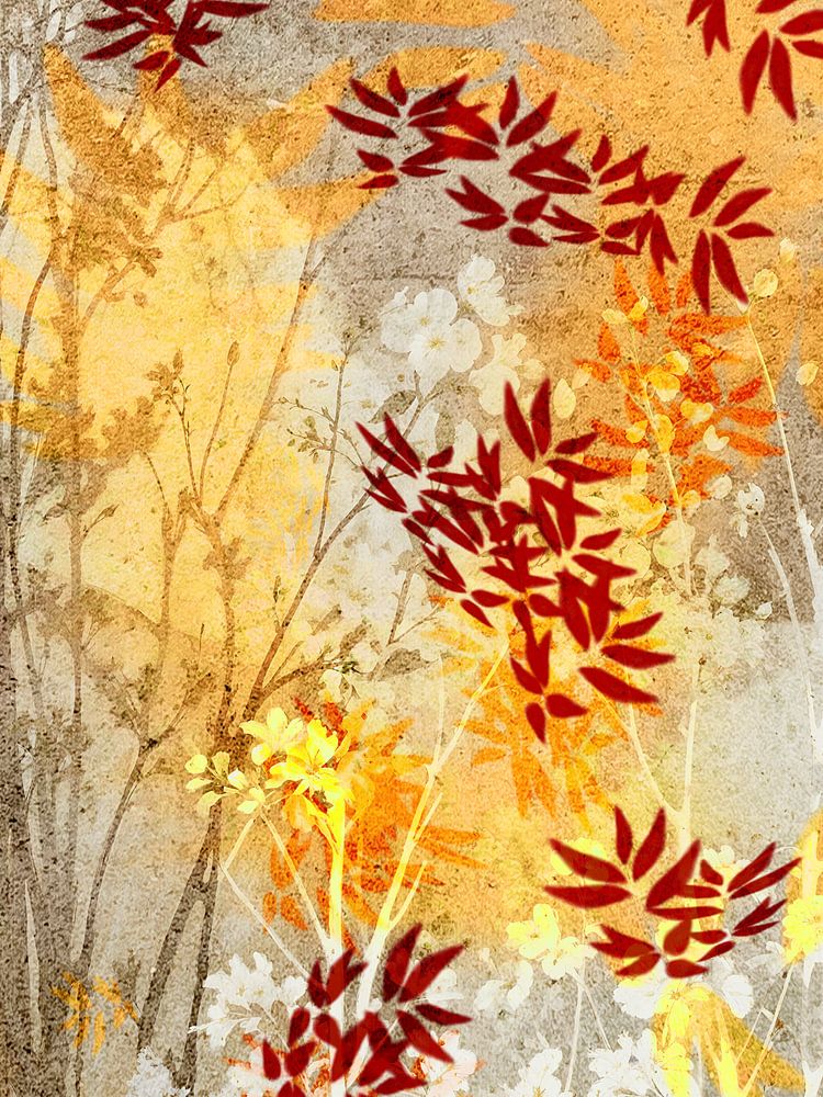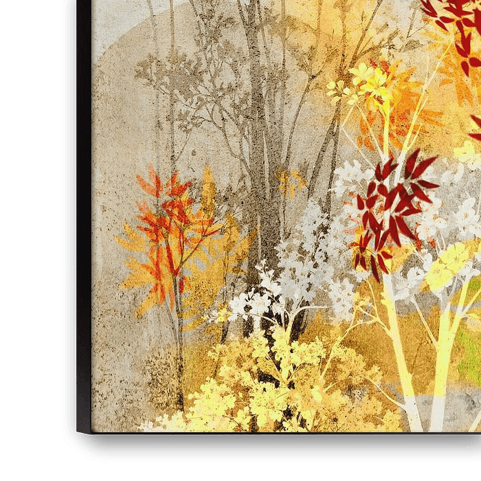 "Colorfull Leaves" présente une composition stratifiée, presque onirique, d'arbres et de feuilles aux teintes variées. L'arrière-plan est constitué de tons gris doux et altérés qui rappellent le papier ou la pierre calcaire, donnant à l'ensemble une impression de texture subtile. Il est recouvert de feuilles aux formes transparentes et organiques, dans des tons chauds de jaune, d'or et d'ocre. Entre ces zones claires, des feuilles plus profondes, rouge rouille, émergent et servent d'ancrage visuel à la composition. Les arbres et les branches sont finement rendus, tantôt nets, tantôt estompés, comme s'ils apparaissaient dans la brume et en sortaient. Ces couches transparentes qui se superposent créent un jeu de lumière, d'ombre et de profondeur.