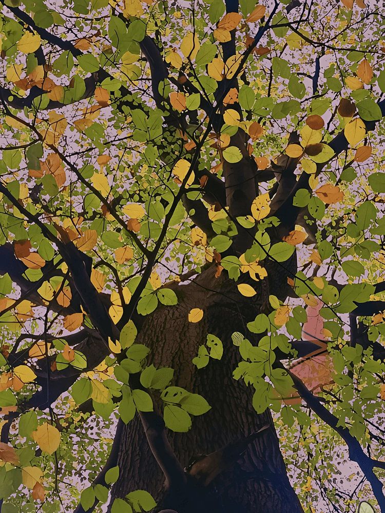 Cette photo dégage un sentiment d'émerveillement et de tranquillité. La perspective est prise de bas en haut, ce qui donne à l'arbre une impression de majesté et de grandeur - comme si vous étiez à nouveau un enfant allongé sous un arbre géant, regardant le ciel entre la canopée. Le tronc s'élève fermement et sombrement au centre de la composition, sa texture rugueuse contrastant magnifiquement avec la palette de couleurs rêveuses des feuilles.