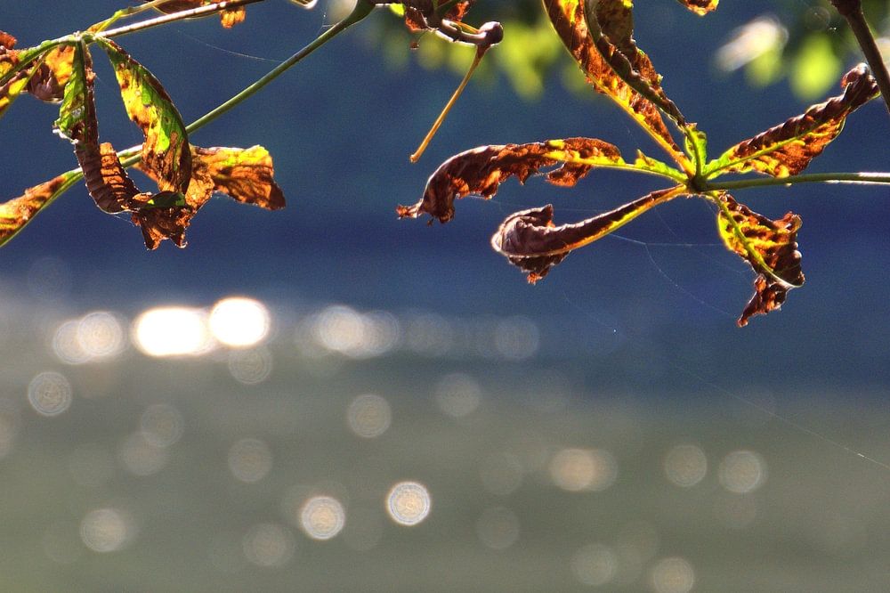 Feuilles de châtaignier et marrons sur un arbre au bord d'un lac en contre-jour