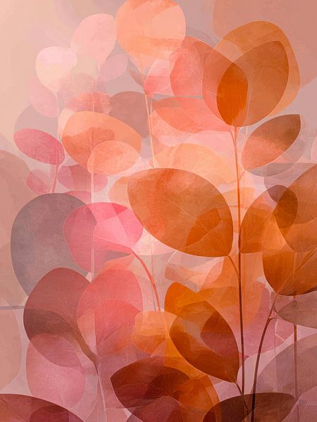 Cette œuvre d'art présente une composition douce et abstraite de feuilles qui semblent flotter les unes au-dessus des autres en couches transparentes. Les tons chauds orange, rose et pêche créent une atmosphère calme et harmonieuse, tandis que les nervures subtiles des feuilles ajoutent une touche raffinée.