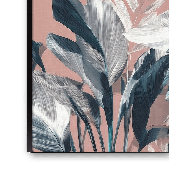 Cette illustration élégante montre une collection de feuilles tropicales dans des tons froids de bleu-gris et de blanc, qui contrastent élégamment avec un fond rose doux. La texture fine du pinceau et l'éclairage subtil lui confèrent un aspect moderne et sophistiqué. Associant des formes naturelles à une composition de couleurs contemporaines, cette œuvre d'art est idéale comme décoration murale dans les intérieurs minimalistes, botaniques ou d'inspiration scandinave.