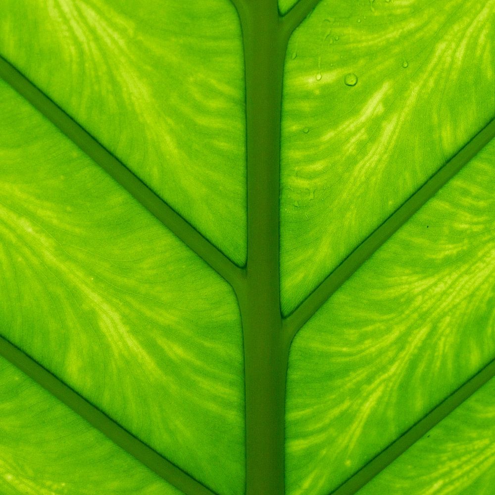 Le dessous d'une énorme feuille tropicale. Les nervures et le motif de la feuille sont clairement visibles à travers la lumière qui traverse la feuille.