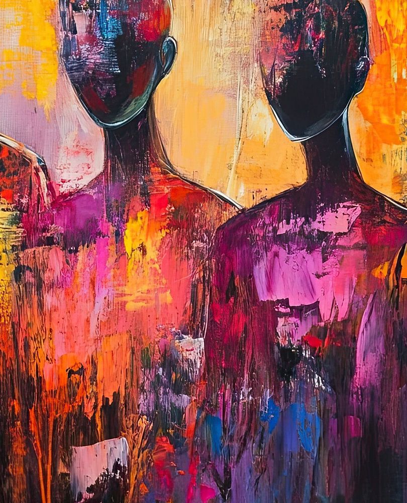Figures abstraites | Cinq silhouettes de personnes en couleur - Cette peinture abstraite représente quatre silhouettes de personnes. Les couleurs sont vives et éclatantes, avec un mélange de violet, d'orange et de bleu qui, ensemble, créent une atmosphère énergique.