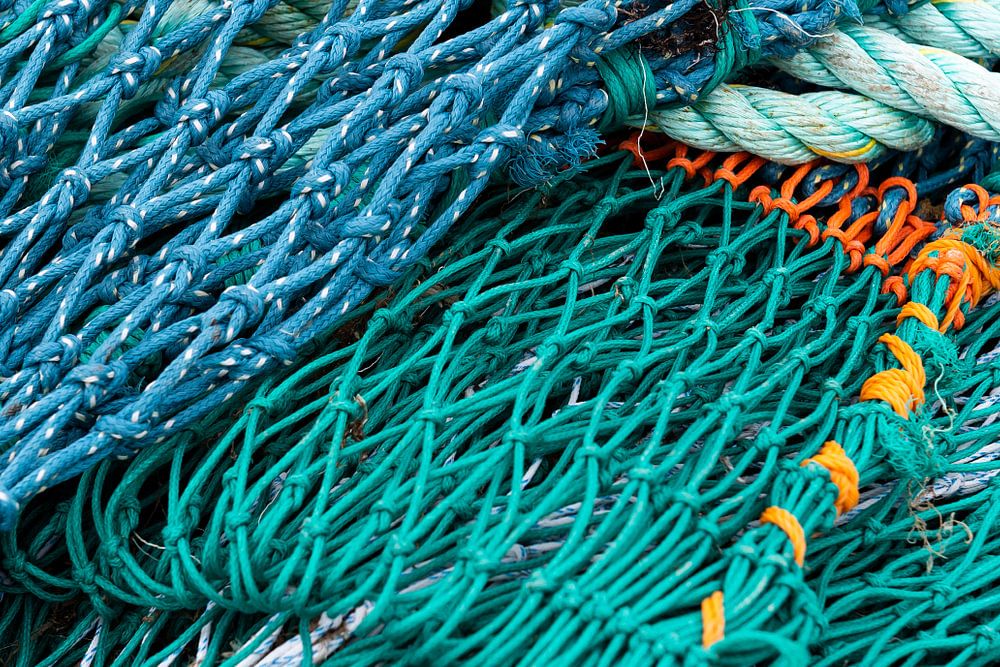 Filet de pêche bleu et vert avec des cordes sur un tas.