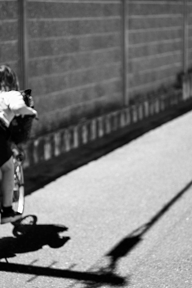 Photo en noir et blanc d'une jeune fille à vélo à Osaka, au Japon. Elle court avec enthousiasme à travers la ville, son énergie étant clairement visible.
