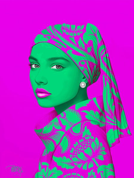 Cette œuvre numérique de l'artiste René van den Berg est une réinterprétation puissante et moderne de La Jeune Fille à la perle. Le profil classique et la boucle d'oreille en perle emblématique restent reconnaissables, mais sont complètement revisités grâce à une utilisation explosive de la couleur. Le visage est représenté dans un vert…