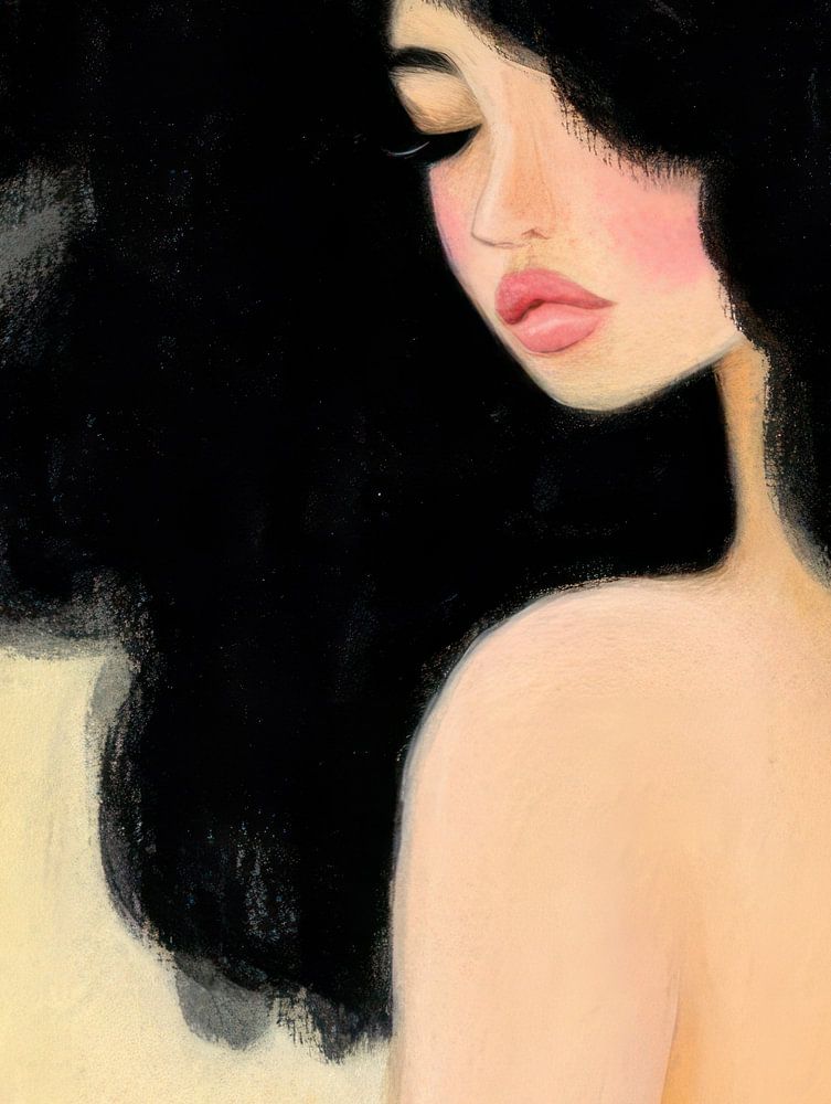 La pose de la femme est discrète et introvertie, avec les yeux fermés ou mi-clos. Elle semble perdue dans ses pensées, dégageant un sentiment de vulnérabilité et paraissant détachée du monde qui l'entoure. Son corps mince et semi-nu est représenté avec des contours minimalistes, sans beaucoup de détails, ce qui permet de garder l'attention sur son visage et ses énormes cheveux. L'arrière-plan est simple et clair, ce qui renforce le contraste avec les cheveux sombres.