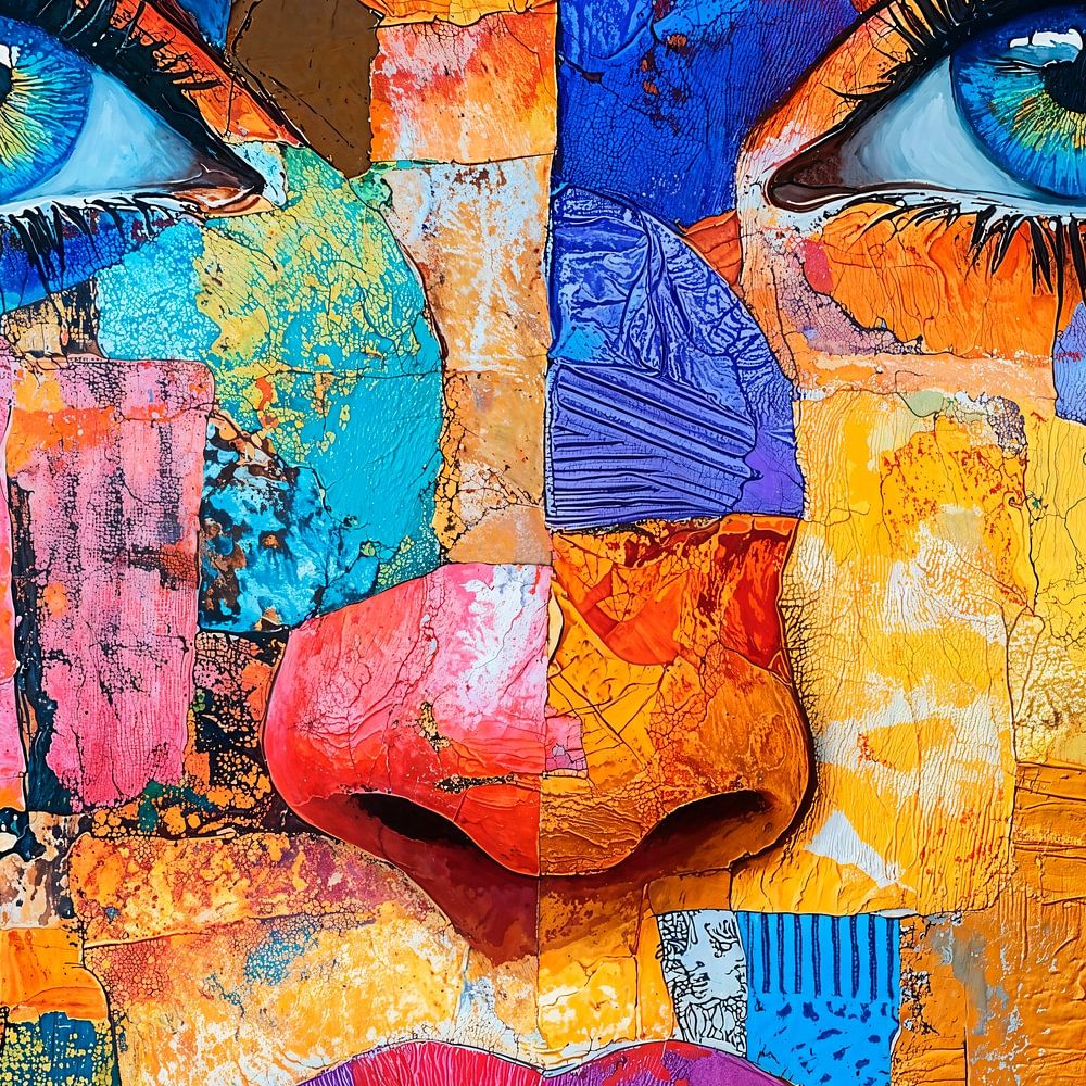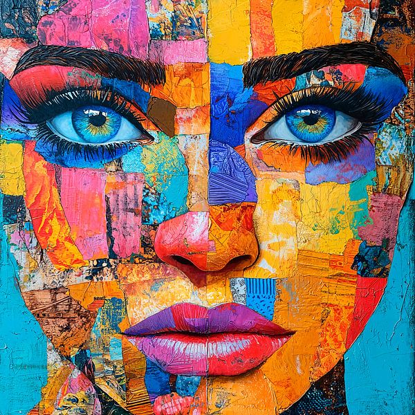 Une œuvre d'art colorée représentant le visage d'une femme, réalisée dans un style collage mixte. Son visage est composé de fragments de papier, de tissu ou d'autres matériaux. Ces fragments sont réalisés dans une explosion de couleurs vives et disposés en formes géométriques et irrégulières. Ses yeux bleus saisissants, grands ouverts…