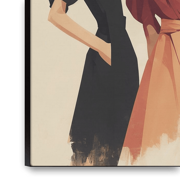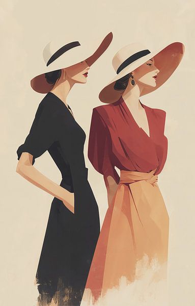 Un portrait illustratif captivant de deux femmes élégantes en tenues vintage, aux tons chauds et aux lignes raffinées. Leurs chapeaux caractéristiques à rubans contrastés et leurs profils minimalistes dégagent un charme Art déco. Cette œuvre picturale allie un glamour nostalgique à une esthétique contemporaine ; sa composition fluide et…