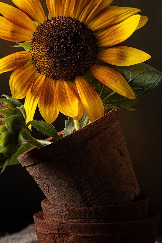 Nature morte des derniers tournesols de l'été. Couleurs chaudes. Pots en terre cuite. Ambiance rurale et nostalgique. Palette de couleurs chaudes avec du jaune, du brun et du vert. Avec le sentiment mélancolique de la fin de l'été.