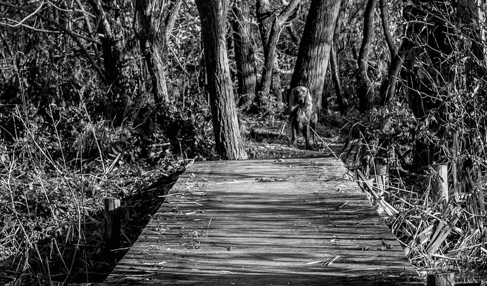 nieuwsgierige hond op natuurpad genomen in natuurgebied de Biesbosch