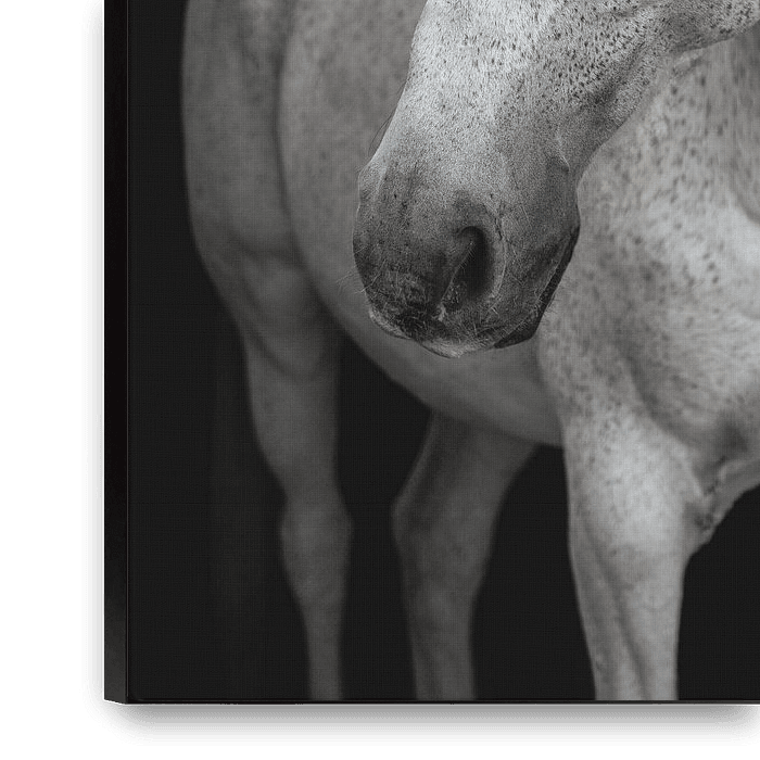 Laissez-vous emporter par la splendeur discrète de ce portrait d'art, qui montre un cheval blanc brillant sur un fond noir profond. Capturé à la lumière naturelle, l'essence du cheval prend vie d'une manière unique. La pose inhabituelle du cheval ajoute une dimension supplémentaire à ce portrait et le rend unique. La tranquillité qui se…