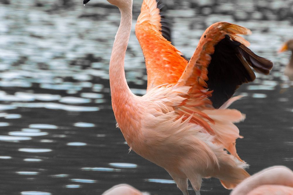 A propos de "Flamant rose aux ailes ouvertes dans un étang avec d'autres oiseaux"