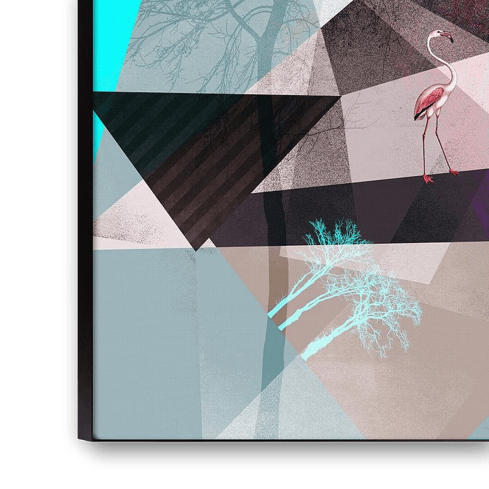 Un flamant se promène dans un paysage graphique fantaisiste, composé de formes géométriques et de silhouettes d'arbres. ©2015/2016 Pia Schneider | atelier COLOUR-VISION.