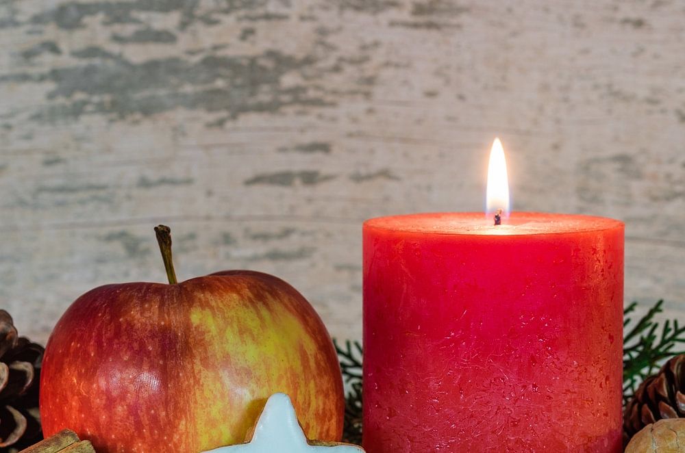 A propos de "Flamme de bougie rouge de Noël avec décoration de pomme rouge, biscuit étoilé et noix sur fond de bo"