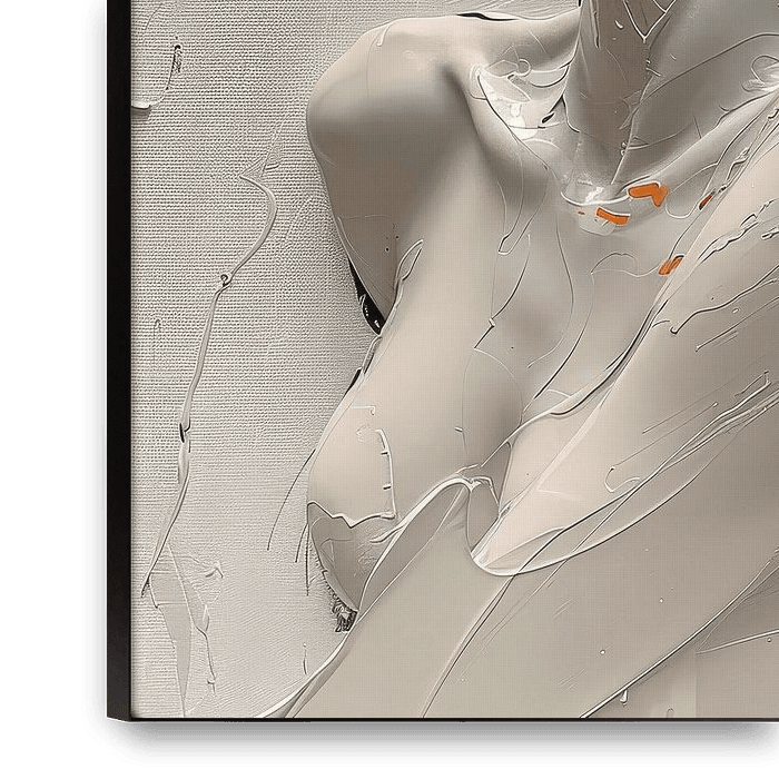 Cette œuvre d'art numérique capture l'intensité de l'émotion et du mouvement dans une représentation abstraite du corps humain. La forme d'une femme, rendue dans des tons doux, presque marbrés, de gris et de blanc, s'étire vers le haut du cou, comme dans un état d'abandon ou de libération. Les coups de pinceau épais et riches en texture…