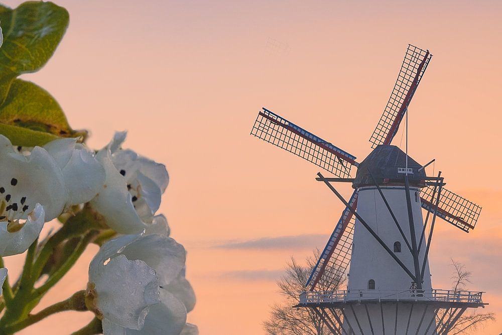 Après une nuit glaciale, j'ai roulé dans le brouillard jusqu'à Molen de Vlinder à Deil. Lentement, la brume du Linge dérive par-dessus la digue et colore le ciel d'un bel orange. Pendant que je profitais du lever du soleil, les fruiticulteurs s'affairaient à arroser les arbres pour protéger les fleurs du gel de la nuit.