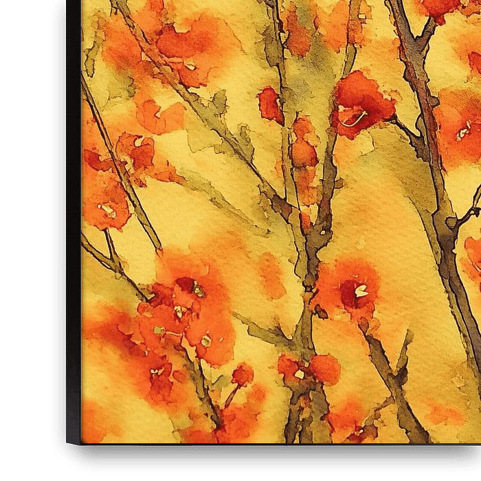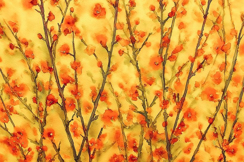 Une œuvre d'art pleine de charme et de vie, où de fines branches ornées de fleurs orange vif se fondent subtilement dans un fond doux couleur or jaune. La technique de l'aquarelle crée des transitions fluides et confère à l'ensemble un aspect léger et onirique.