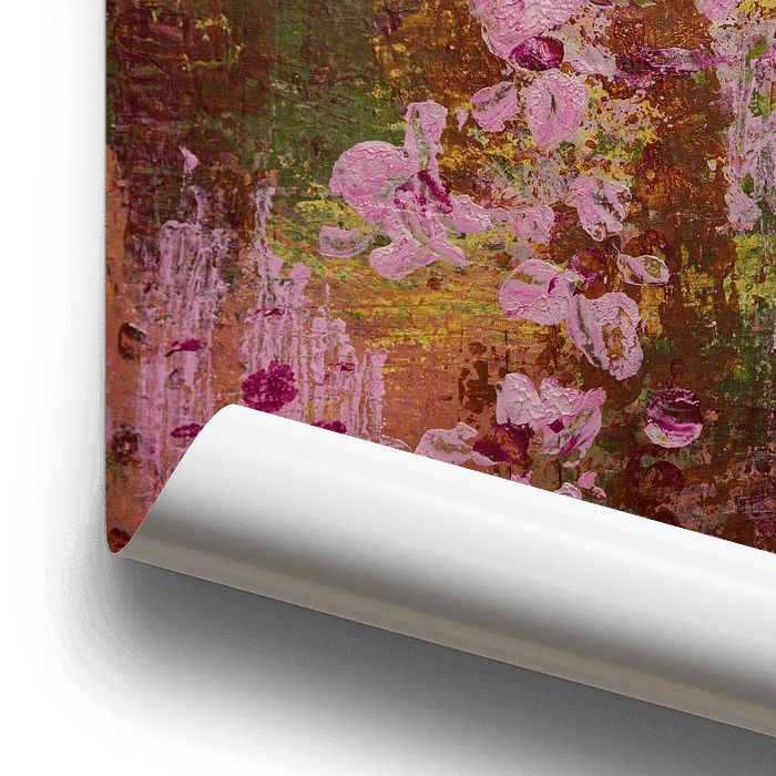 Cherry Blossom Abstract - De vibrantes traînées et éclaboussures de couleurs créent une représentation abstraite de fleurs de cerisier sur un fond texturé. L'image évoque une esthétique grunge avec son application grossière et superposée de roses, de verts et de jaunes.