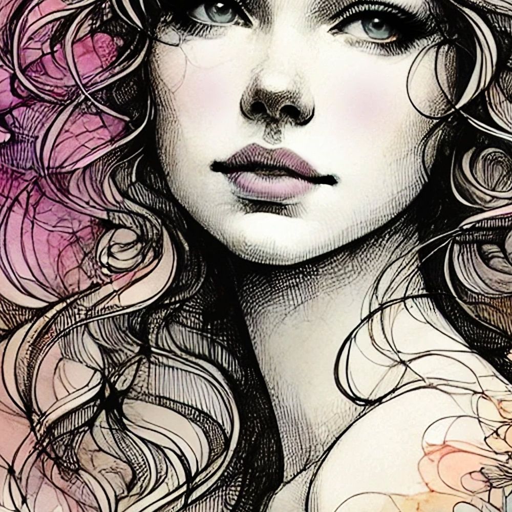 Portrait élégant et expressif d'une femme, dessiné en fines lignes et entouré de fleurs dans un style aquarelle. La combinaison d'une illustration nette en noir et blanc et d'éclats de peinture colorés donne à cette œuvre une impression à la fois vibrante et tranquille. Les fleurs semblent refléter son monde intérieur, plein de couleurs, de force et de tendresse.