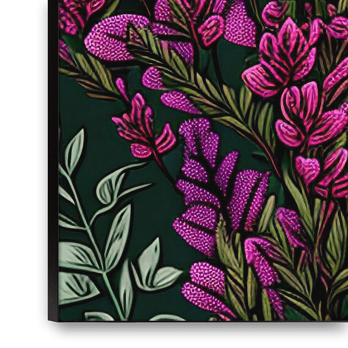 Cette œuvre d'art saisissante présente des éléments botaniques roses vifs sur un fond sombre et profond, créant ainsi un contraste spectaculaire qui captive l'œil. Des motifs entrelacés et un feuillage luxuriant donnent vie au design et lui confèrent un sentiment d'énergie et de mouvement. Parfait pour apporter une touche botanique…