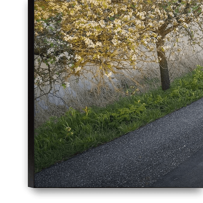 Les arbres fruitiers de cette digue de la Betuwe sont en pleine floraison. La lueur chaude du soleil couchant, le ciel bleu et le vert frais de l'herbe complètent le tableau hollandais !